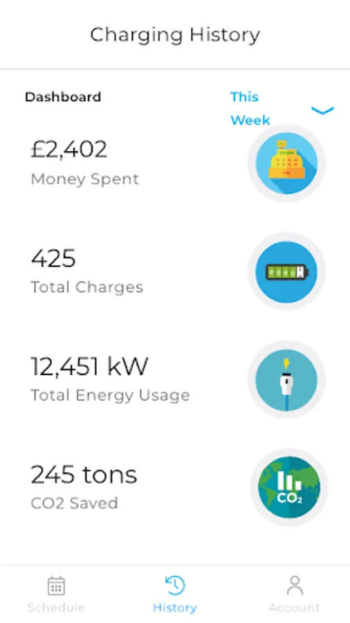 - History dashboard with recent charges and info including money spent, total kWh’s, the total number of charges & CO2 saved
