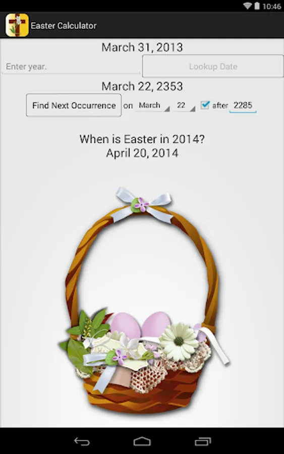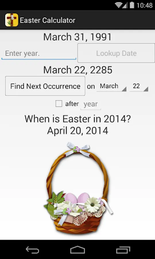 This app calculates when Easter Sunday fell or will fall after 1582 AD and before 4100 AD. It also calculates the next time Easter Sunday will fall on a particular day in March or April.