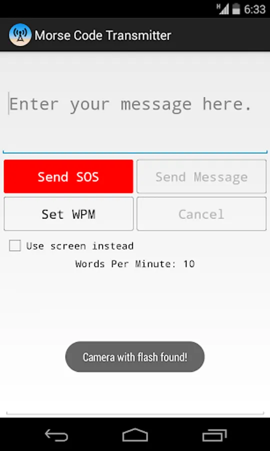 New in version 1.1: If your smartphone or tablet doesn't have a camera with flash, no problem! The app will use the screen to transmit messages by changing the background color and alternating between black and white. Check out the video to see the app in action.
