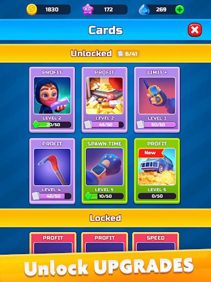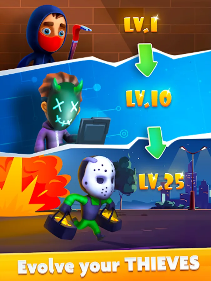 Tap to rob and become the master of bank robbery in this heist clicker to loot cash, all gold & other treasures. Master your robbing skills to make more money. Tap and join robbers to become the richest boss of the robbing city.