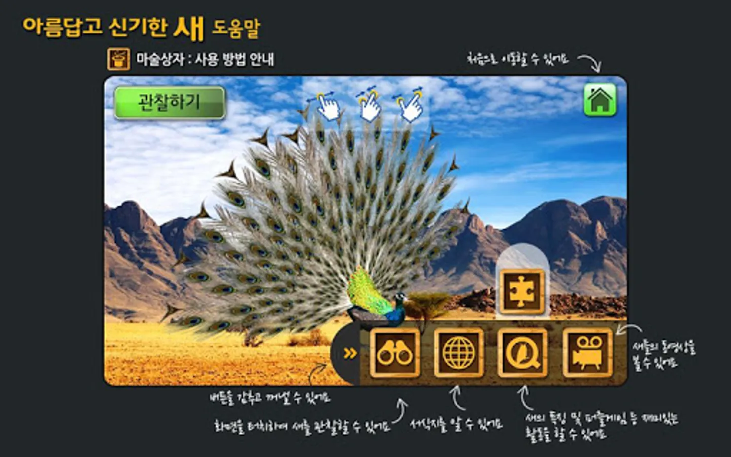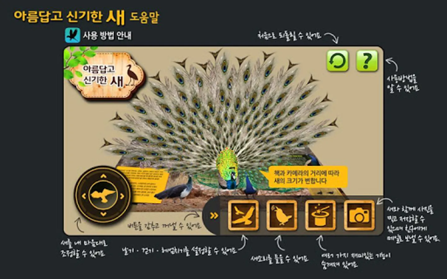 - AR(Augmented Reality, 증강현실)을 기반으로 다양한 증강현실 책의 이미지를 인식하여 페이지 별로 해당 내용과 연관된 증강현실 애니메이션을 보여주는 어플리케이션 입니다.
