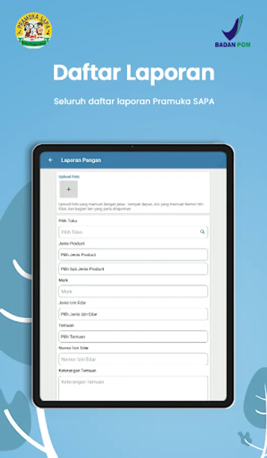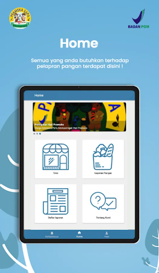 The Pramuka Sapa application is an Android-based reporting application that can be used by members of the Scout Movement to report findings of expired, damaged, and processed food without a distribution permit in circulation.