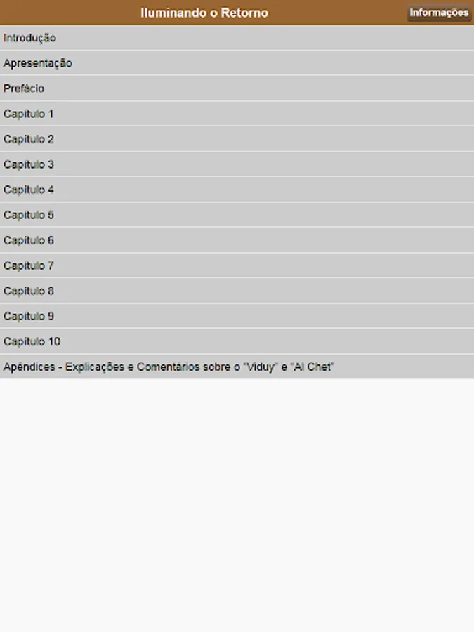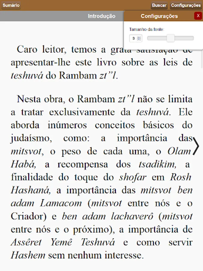What is teshuvah ?; teshuvah was created before the world; even when you can do teshuvah ?; Viduy; teshuvah on involuntary sins; mitzvot calot and chamurot mitzvot; what to do without the Bet HaMikdash ?; different types of teshuvah; chilul Hashem: Dead ?; teshuvah guemurá: a complete teshuvah; teshuvah at different levels; clear thinking; the Ten Days of Repentance; always forgive; forgiveness that comes from the grave; tzaddik, or rasha benoni ?; mitzvah and do not regret it; judgment on Rosh Hashanah; benoni - tie between mitzvot and averot; who has Olam Haba, the World to Come ?; the strength of teshuvah; all have a chance; self-criticism; five hindrances; internal change: the challenge; free will; three exceptions to the broad range of Bechira; positive envy; Hashem wants our teshuvah; no cure; "Tefilat Hashav" the tefillah of Rabenu Jonah; Arbaa yessodot - fire, water, air and land; bad companions; nervousness; hate; envy; lack of seriousness; not run wildly after money; frantic search for honors; teshuvah on the negative virtues; three abstract concepts: Hashem, neshamah and Olam Haba; without bodies ... for now; Hashem, the greatest engineer of the world; Olam Haba and his reward; the reward; love because of Hashem; explanations and comments on the "Viduy" (Confession) and "Al Chet".