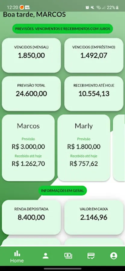 In summary, the "Caixinha de Financeiras" application offers a dashboard for viewing individual values, controlling monthly payments, loans with interest divided among participants, controlling maturities and a complete record of loan transactions. At the end of the process, each participant receives back their initial deposit, plus interest on the loans. This allows friends and family to manage their savings seamlessly and efficiently throughout the year.