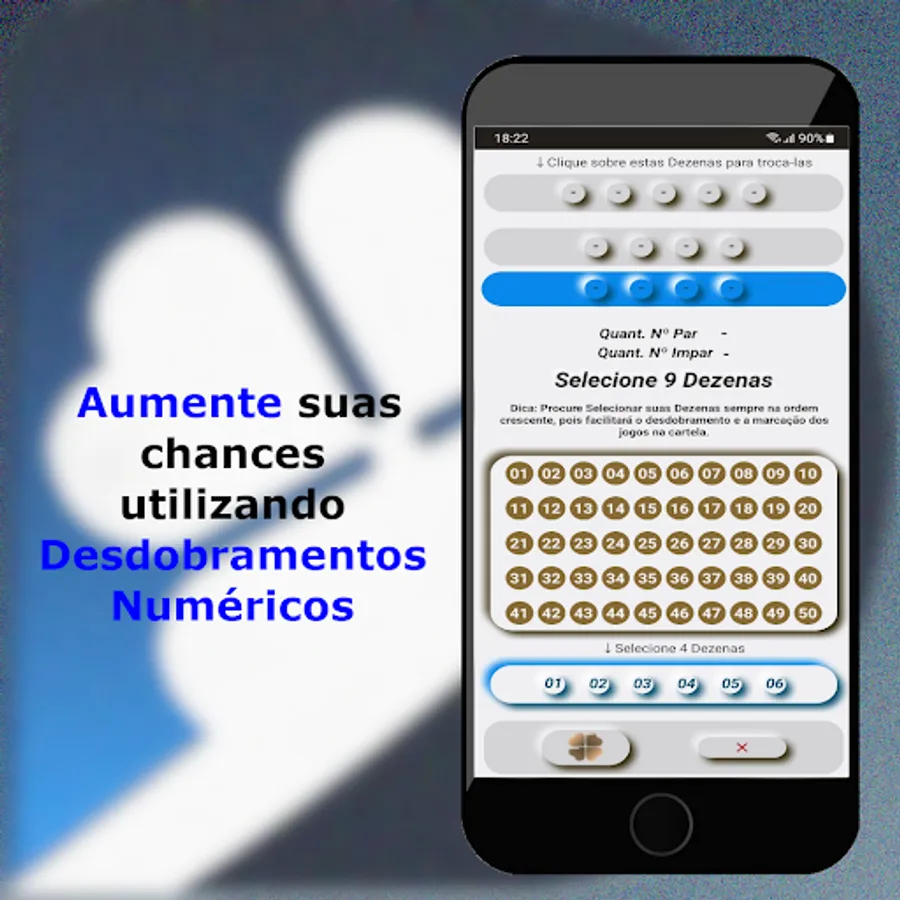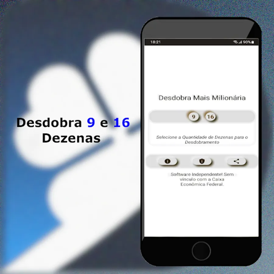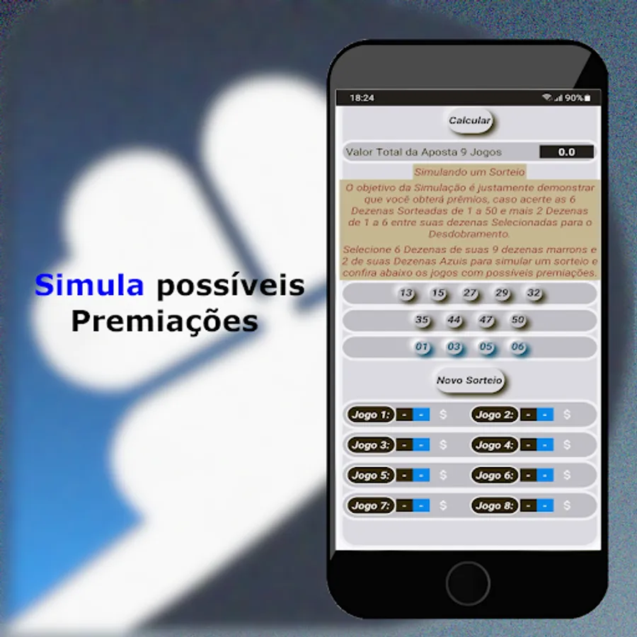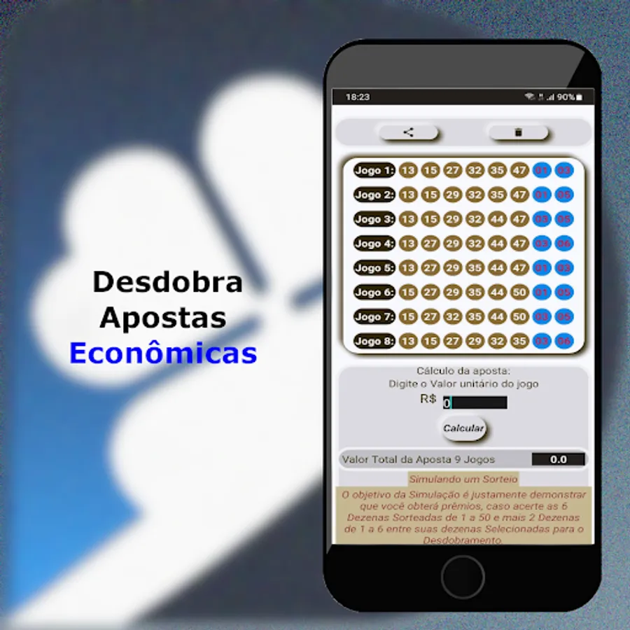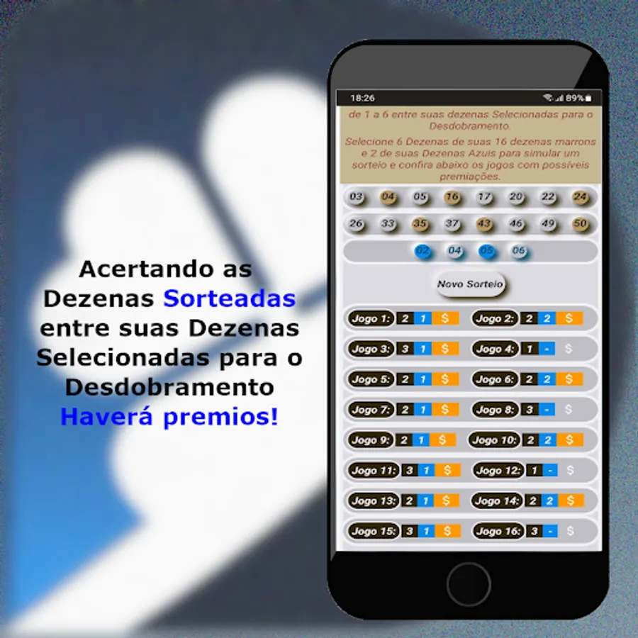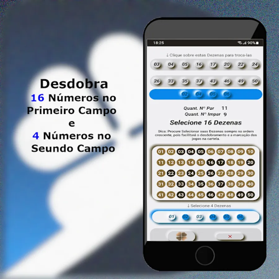 The Desdobra + MIL Application will unfold 9 and 16 tens, chosen randomly by the user, and will formulate the unfoldings for 9 selected tens. 8 games will be generated with 6 numbers each and two more numbers corresponding to the second field of Lottery numbers.