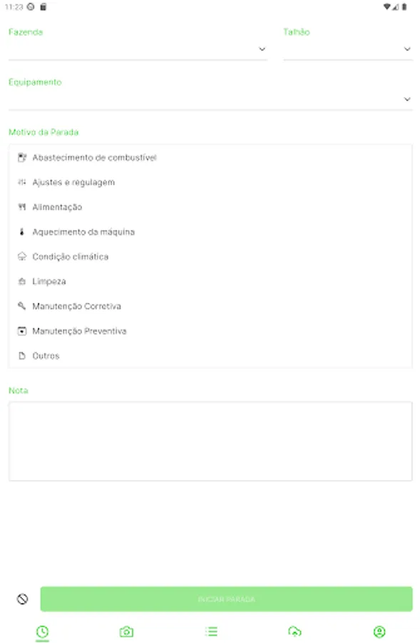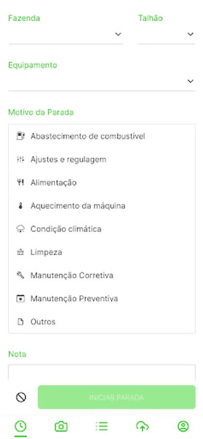 By using the application, users can record the specific reason for each stoppage of agricultural equipment. This may include reasons such as power supply, preventive maintenance, corrective maintenance, weather conditions, cleanliness, and other relevant reasons. The idea is to provide an organized and centralized way to document this information, making it easier to analyze and plan agricultural activities.