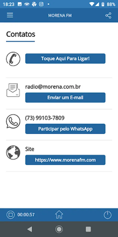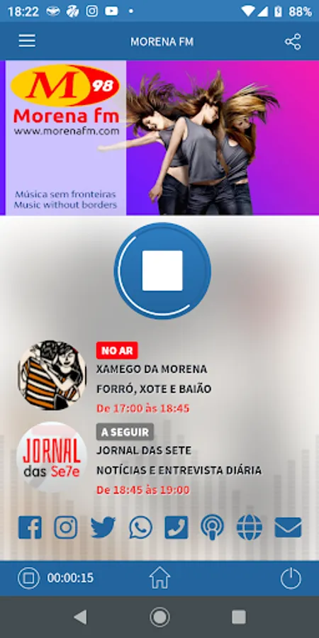 Use our app to listen live, pair with the car stereo, access our social networks, stay on top of events, shows and promotions, speak directly with the announcer via WhatsApp.