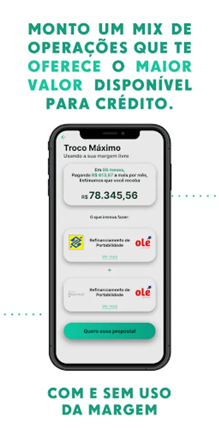 Maximum Change: In this proposal we will outline the best strategy for you to release the highest possible amount of change. For this, we will seek the best interest rate for portability of the contract and, then, we will refinance it at the lowest possible interest rate. In addition, we will use free margin to slightly increase the amount released! This opportunity is great for those who are in need of considerable value!