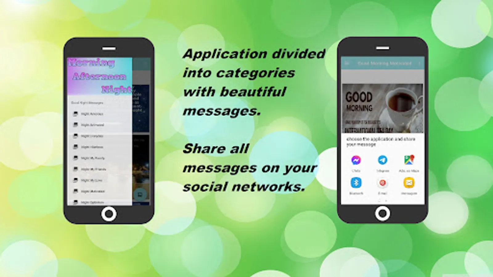Application divided into categories with beautiful ready-made messages. This application is free and contains: good morning, good afternoon, good night and messages for friends, loved ones, family, etc. Themes covered in this application: love, affectionate, cheerful, funny, motivational, optimism, reflection and weekly.