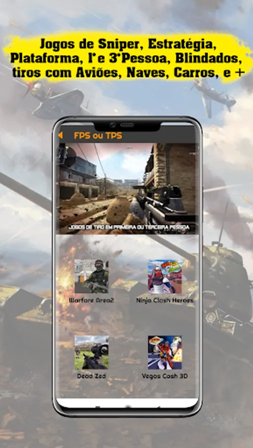 Here you have many 1st person shooting games, various 3rd person shooting games, war strategy games, war vehicle games, platform shooting games, various war games, world war 1 games, WWII, sniper games, air battle, naval battle, tank battle, all in one app.