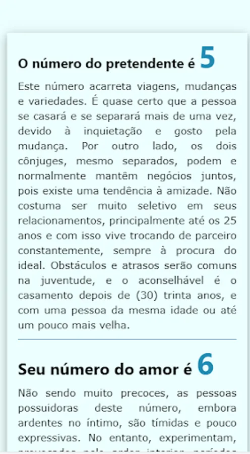 Individuals with the same number of Love are compatible and harmonious, but the relationship tends to become monotonous over the years, except for the number 5 (five), where one element completes the other.