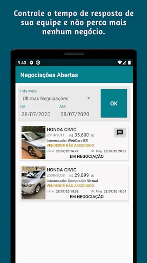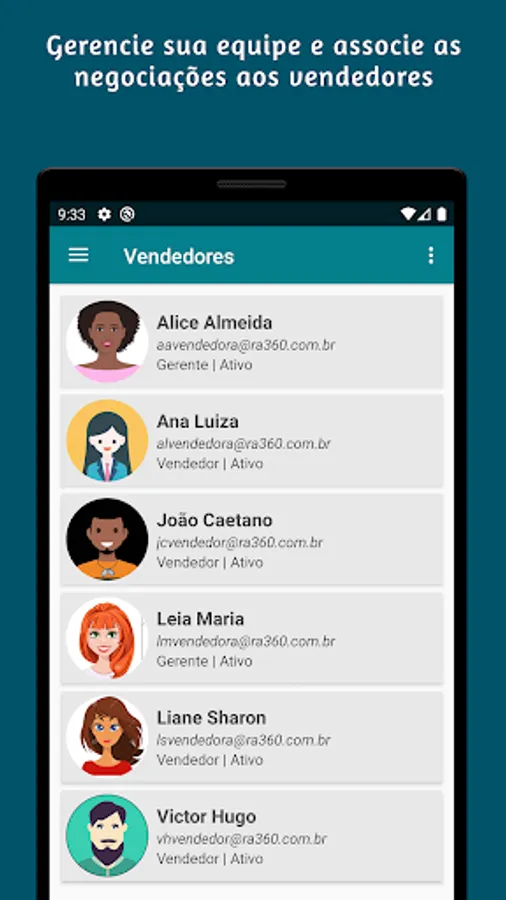 • Consult the entire team's sales funnel at any time (negotiation status, lost and realized sales)