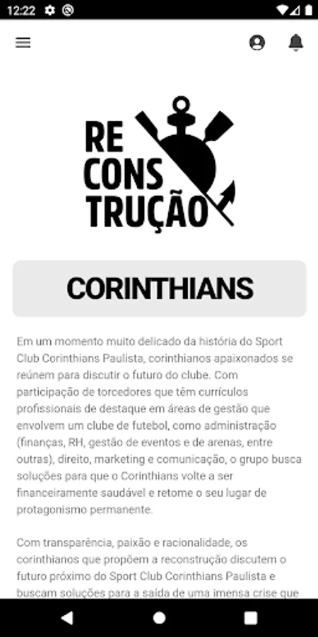 The RECONSTRUCTION app emerges to democratize the participation of fans and members of Sport Club Corinthians Paulista, with resources for interaction and exchange of important information to achieve the best administration and management of the club, pointing out ideas, constructive criticisms and suggesting possible improvements. Together, we can help Corinthians to be even bigger and better.