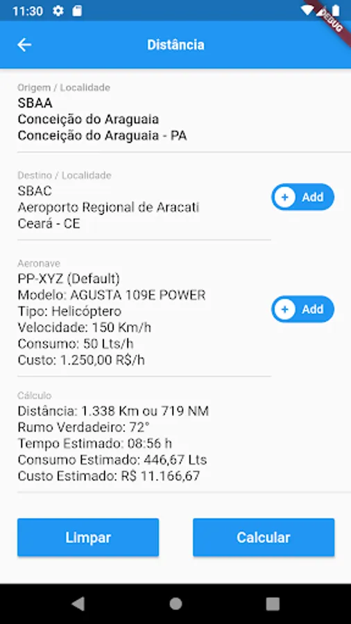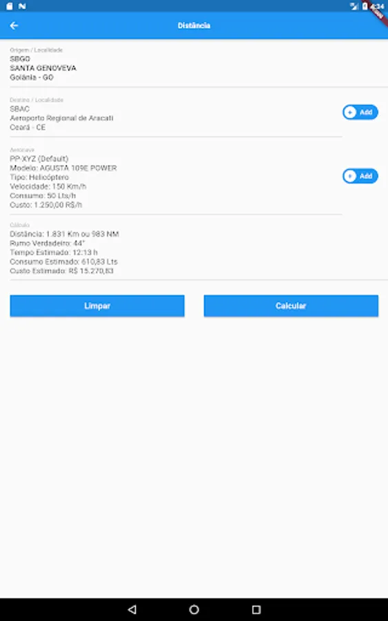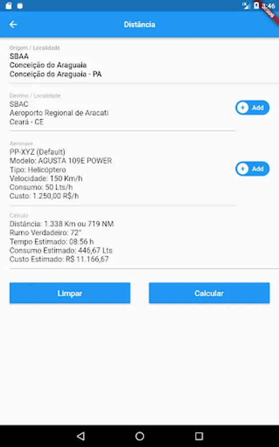 - Calculation of the distance between two points with estimated time, cost and consumption information according to your aircraft parameters.
