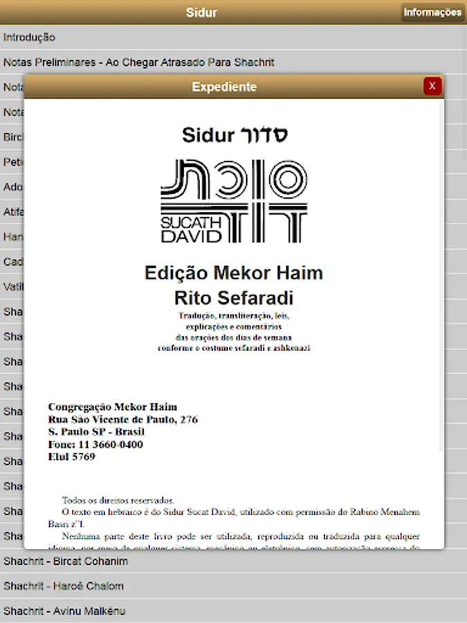 Coordinated and commented by Rabbi Isaac Dichi (Rav Dichi), the Congregation Mekor Haim, the Siddur Sucath David translated into Portuguese was a work of more than 10 years, developed by the team of the Congregation Mekor Haim.