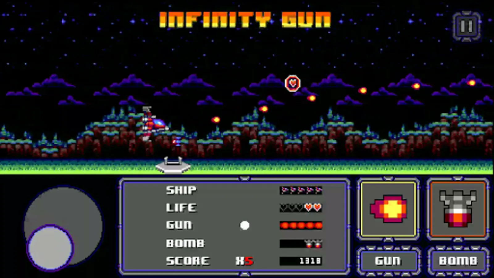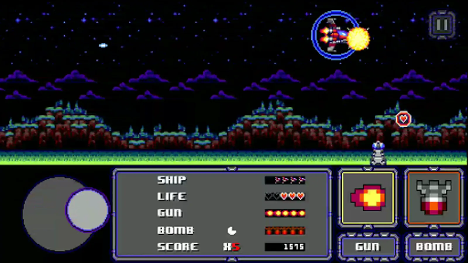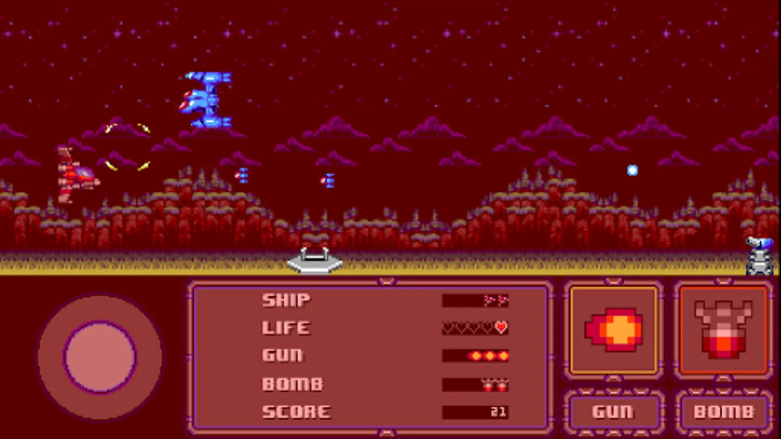 The classic side scrolling shmup action starts off slow and builds the longer you play. There is no end so the only limit is your skill. Responsive virtual analogue controls allow you to duck and weave through waves of enemies as you shoot and bomb your way to glory.