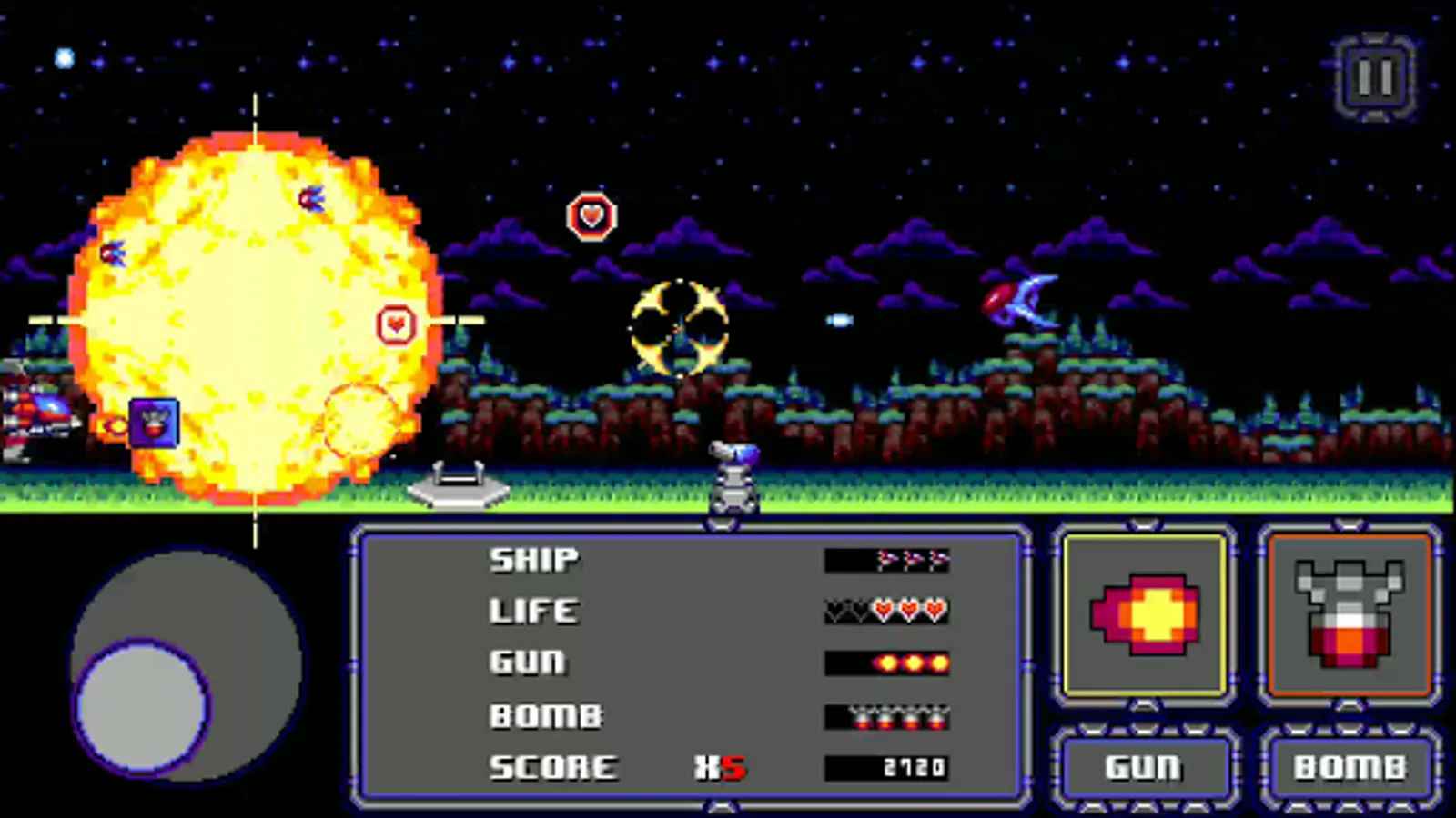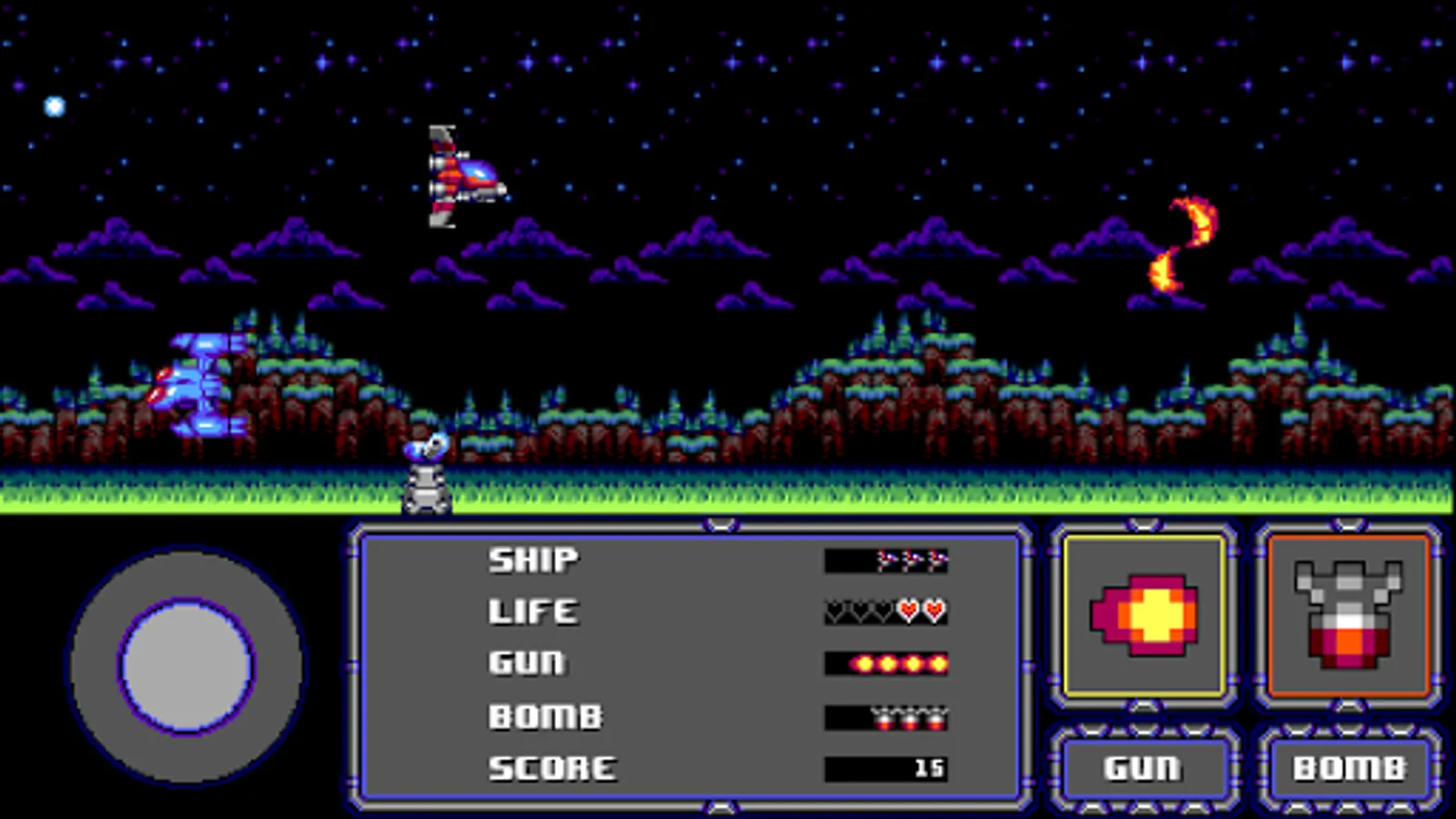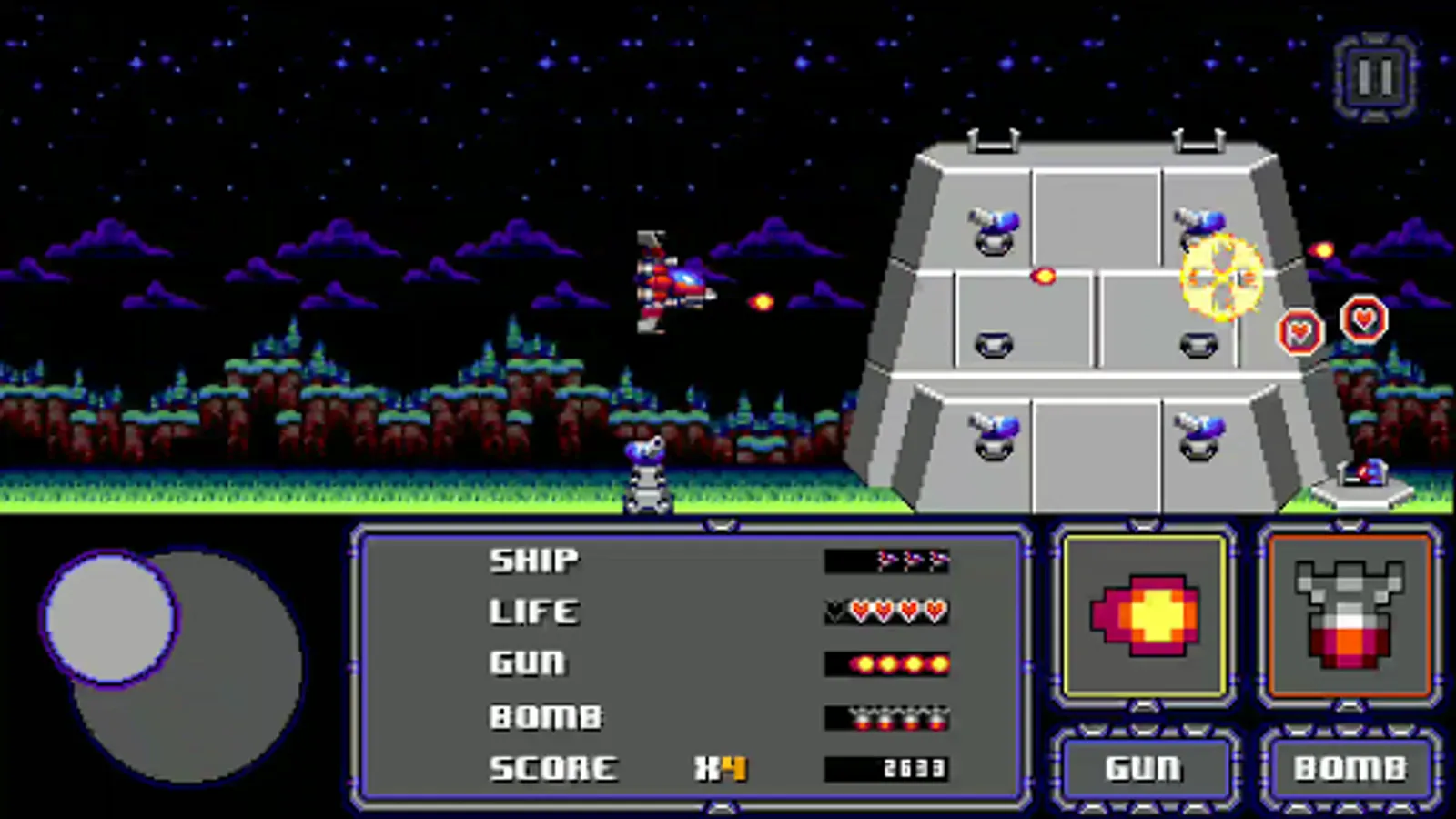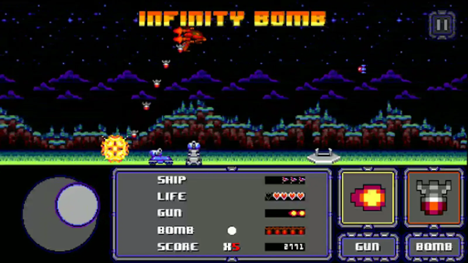 The classic side scrolling shmup action starts off slow and builds the longer you play. There is no end so the only limit is your skill. Responsive virtual analogue controls allow you to duck and weave through waves of enemies as you shoot and bomb your way to glory.