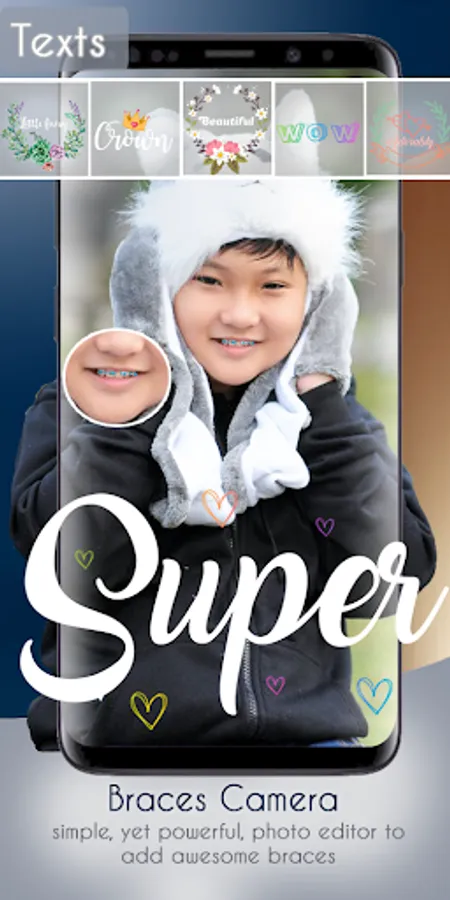 - Braces Photo Editor with 200+ photo stickers like Braces,Lipstick, Eyelashes, Eyebrow, Piercing, Hairstyle, Eye lens and Text Editor to Add text to your photos.
