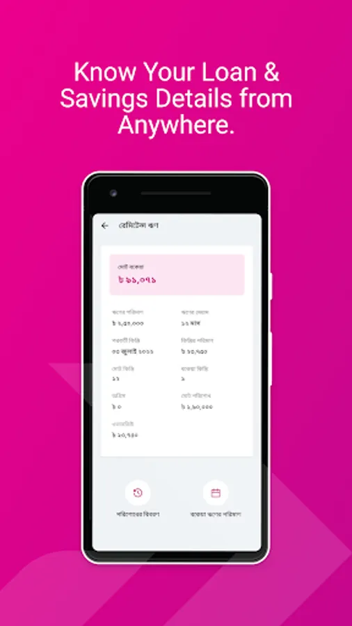 You can now access information of all your active loans and savings information from anywhere at any time right after login. You can also access detailed information and check your outstanding along with the due date.