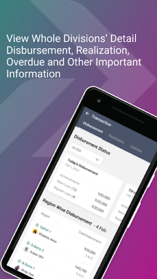 Use the app to monitor the information of relevant location consolidated data of disbursement, realization, overdue, member, transaction status, and open branch list.