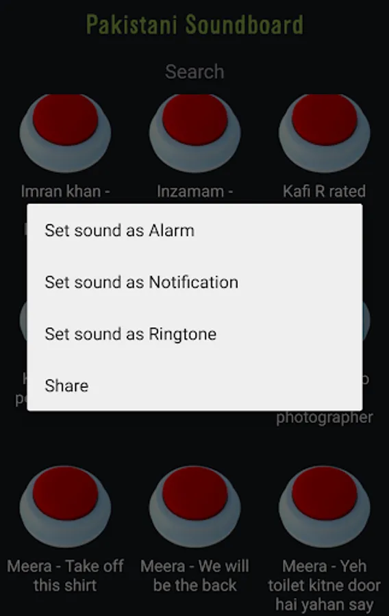 With the Pakistani Soundboard, you can easily share your favorite sounds via Whatsapp, Bluetooth, etc. You can also set any sound as your ringtone, notification or alarm.
