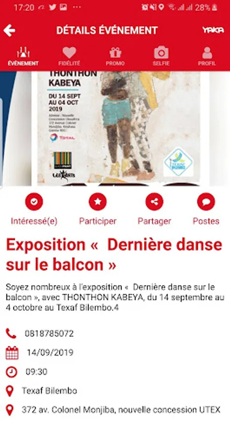 The menu "EVENTS", it makes you discover the best plans, events of Kinshasa compared to your geolocation. You will be able to confirm your participation and comment on the event that interests you in due time.