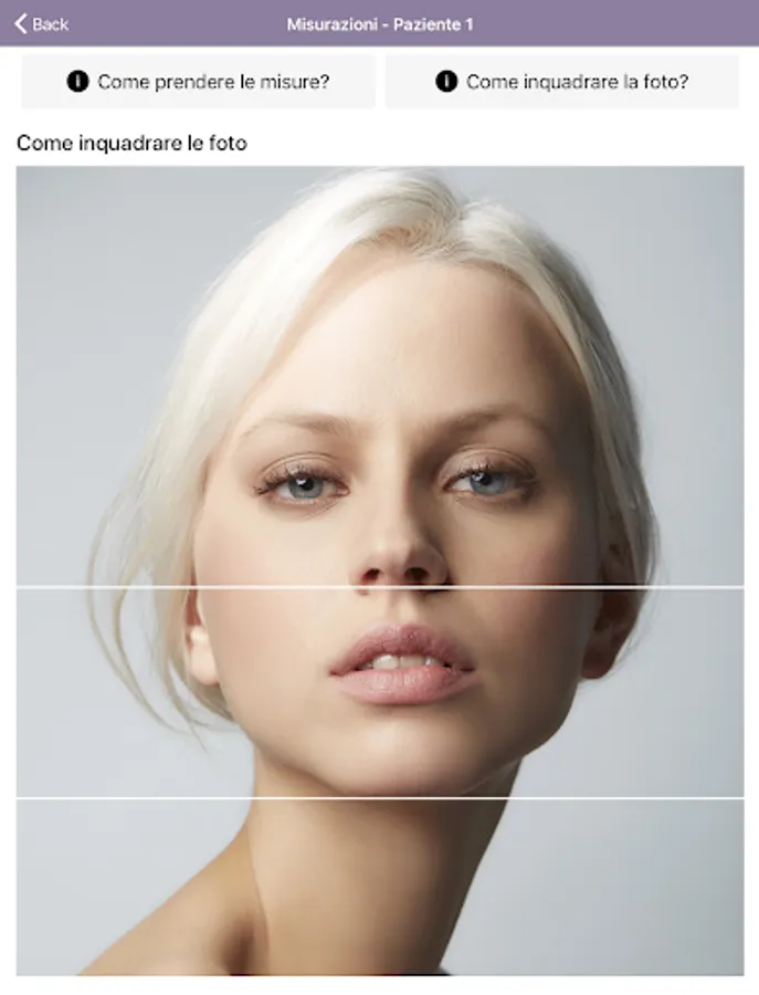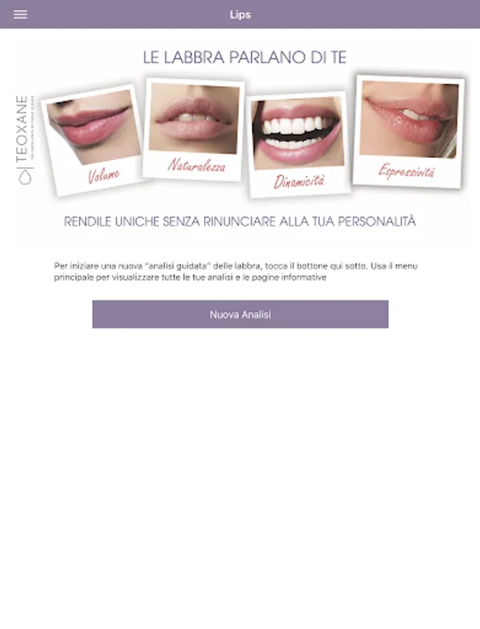 The App also allows you to take photographs before and after the treatment, automatically side by side, in order to have a visual feedback of the result achieved with respect to the starting point. The content of the App are complemented by bibliographic information that is the basis of the algorithm and scientific and technical information relating to TEOXANE filler dedicated to his lips.