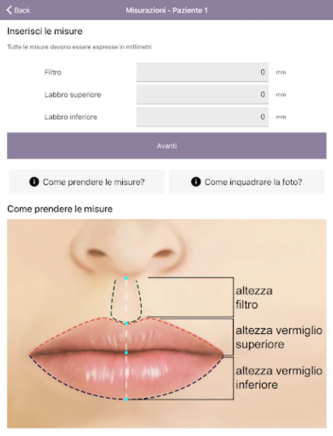 To register and access the service simply indicate its own email address and specify your profession, choosing between "medical aesthetic", "plastic surgeon", "dermatologist" or "other". Then you are ready to begin. By tapping the button "New Analysis", the App will guide the medical step by step in entering the necessary data. You will be asked to insert, first, first and last name of the patient and then three measures in millimeters relative to the height of the filter, the upper lip and lower lip. If in doubt about how to proceed, you can tap the button "How to measure?". The App immediately provide the response indicating automatically if it is necessary to proceed to a correction and, if so, will quantify (always in millimeters) the recommended correction and the optimal result to be achieved on the upper lip, the lower lip or on both. It will be also given an indication about the recommended filler.