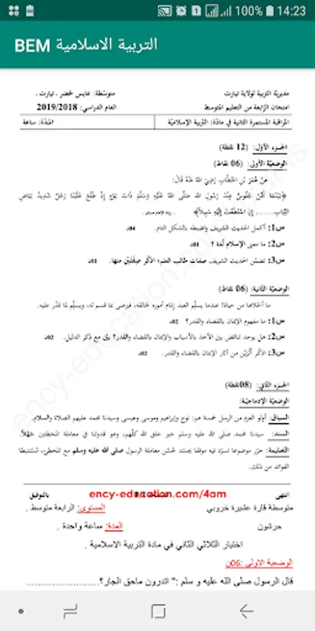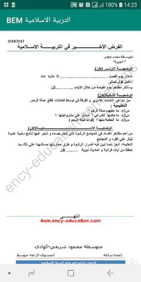 Tests, subjects and topics of certificate in Islamic Education, fourth year intermediate. Useful for teachers and students