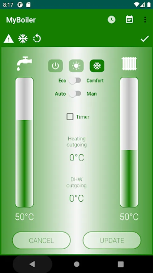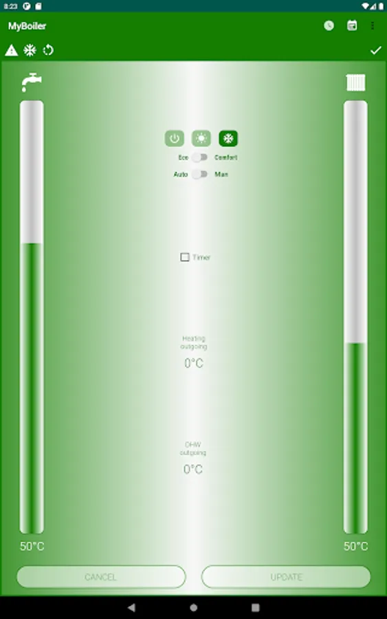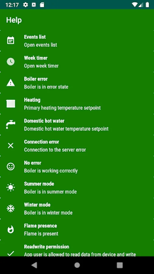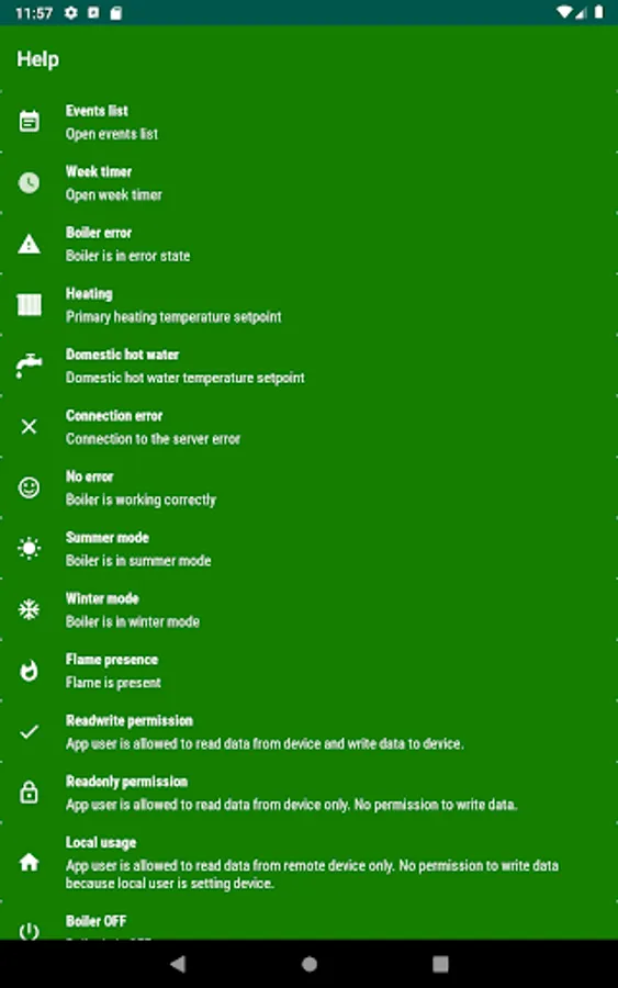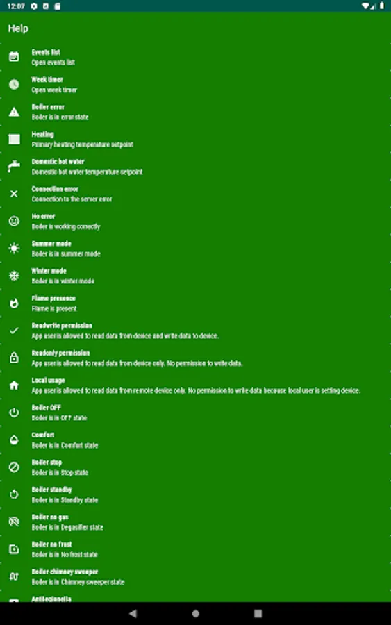This app allows reading status and programming a boiler. It is possible to read outgoing temperatures, setpoint temperatures, operative mode, week timer and events list. Remote user can program setpoint temperatures, week timer and operative modes.
