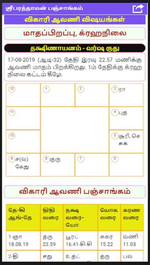 year, Ayanam, Rudu, Date, Day, Thithi, Star, Yoga, Karana, Chandrashtama,
