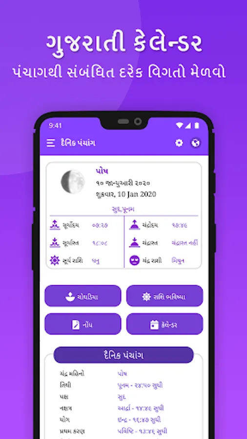 ‘Gujarati Calendar 2020' offers a detailed information on various legends associated with it, which includes sunrise/sunset time, moonrise/moonset time. Moon/Sun zodiac signs, Nakshatra, Tithi, auspicious Muhurat etc. This Panchang also presents the planetary position and Hora chart for day and night.