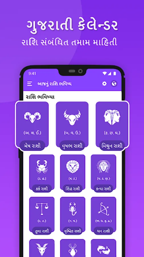 આ એપ્લિકેશન બધા ગુજરાતી તહેવારો, રજાઓ અને શુભ દિવસો આપે છે. ગુજરાતી કુંડલી અથવા હિન્દુ જ્યોતિષીય માહિતી પણ એપ્લિકેશનમાં છે