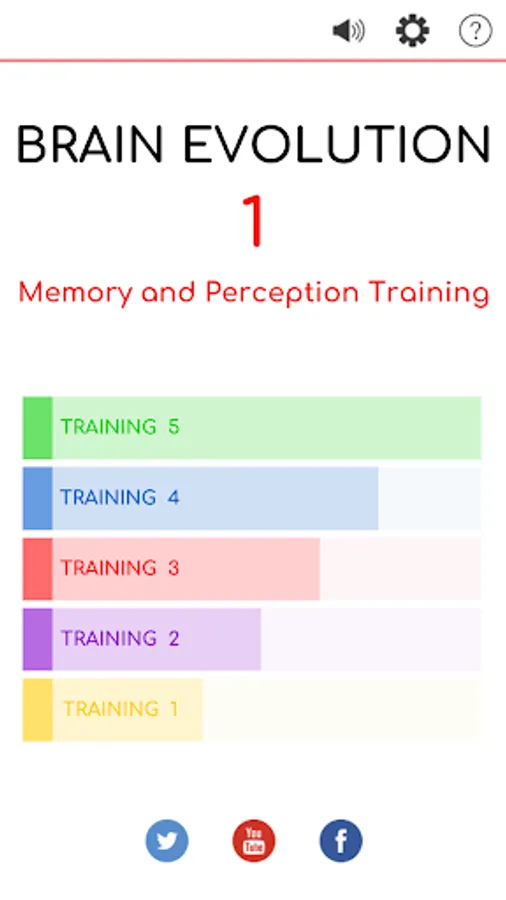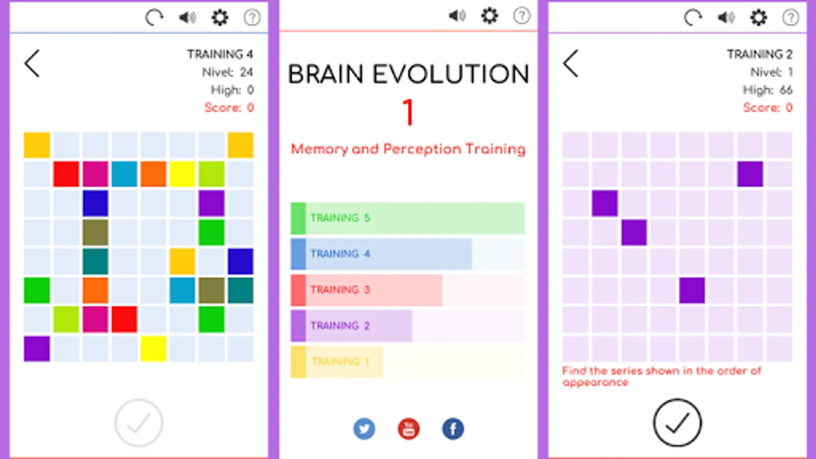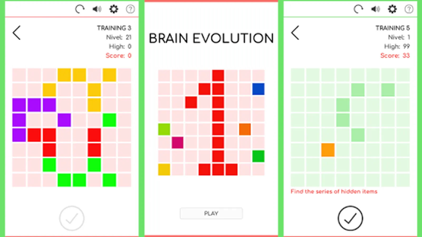 BRAIN EVOLUTION 1 is the first application of the BRAIN EVOLUTION series, it includes 5 workouts with 28 levels each that allow progressive training of perception and memory.