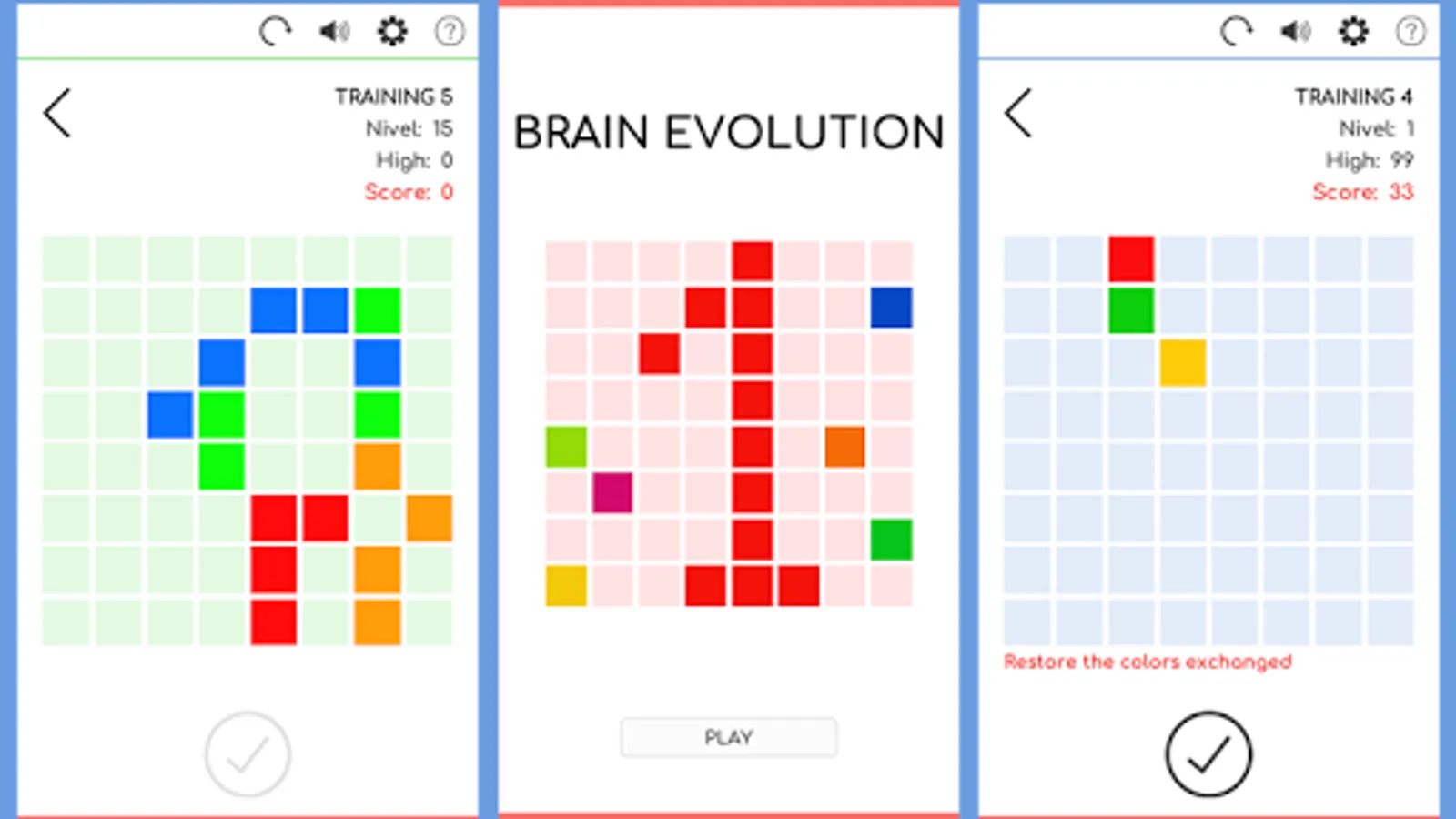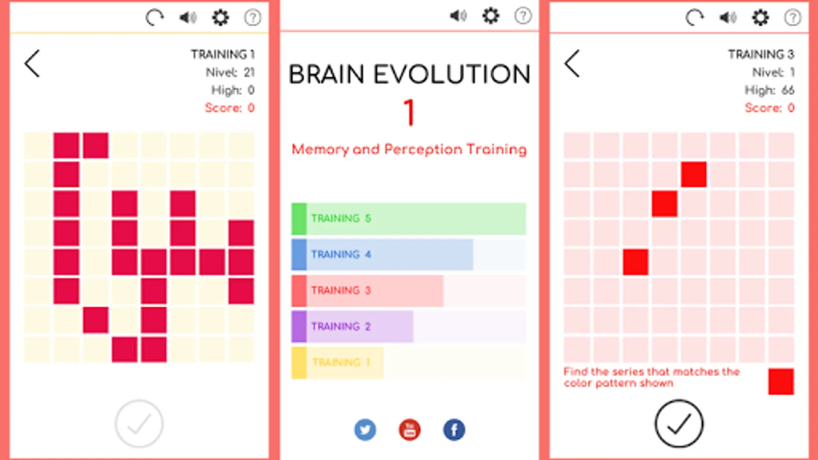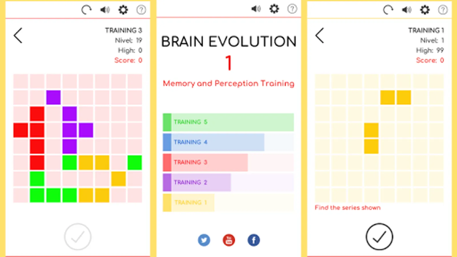 BRAIN EVOLUTION 1 is the first application of the BRAIN EVOLUTION series, it includes 5 workouts with 28 levels each that allow progressive training of perception and memory.