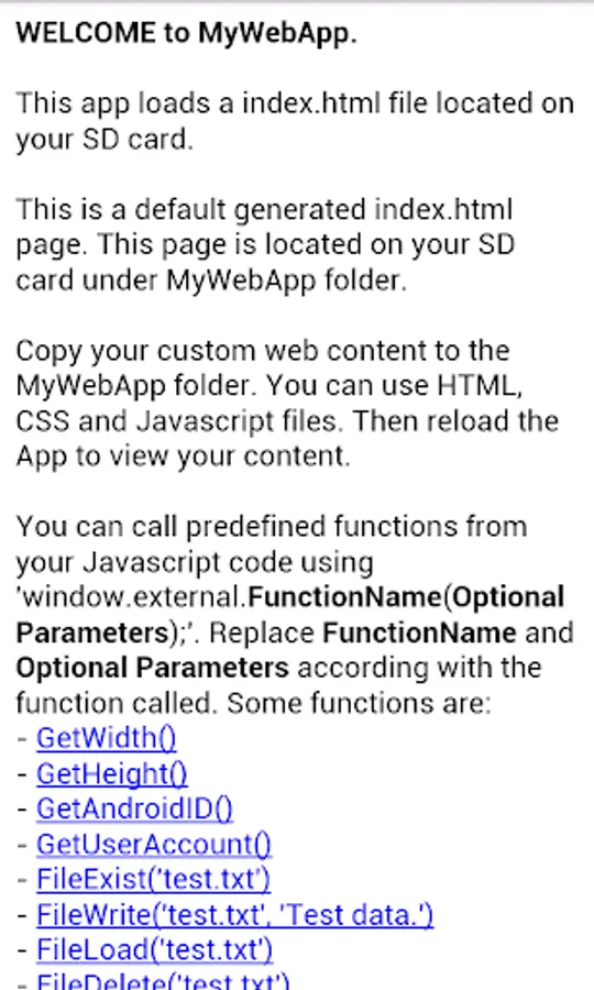 MyWebApp is an Android App that loads a index.html (local web site) file located under MyWebApp folder of your SD card.