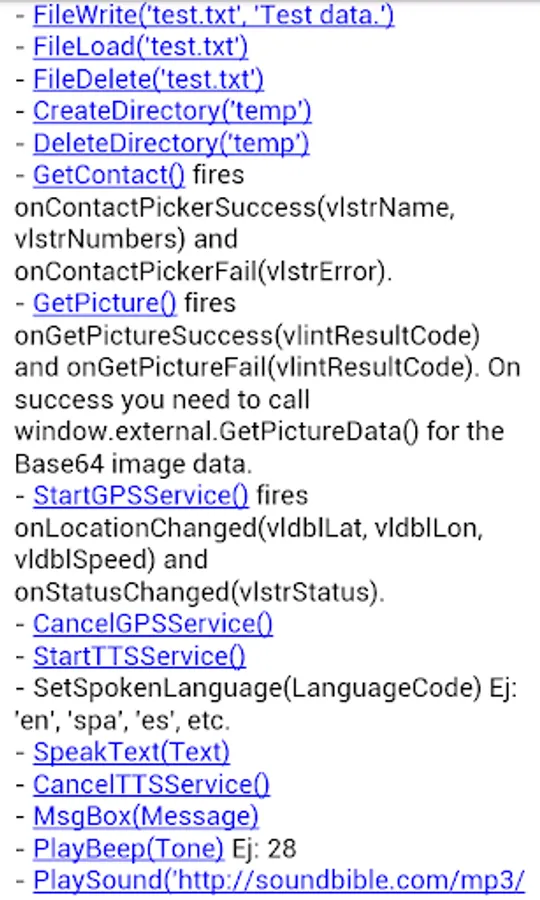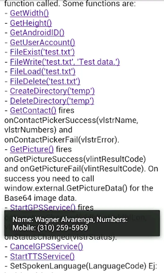 - GetContact() fires onContactPickerSuccess(vlstrName, vlstrNumbers) and onContactPickerFail(vlstrError).