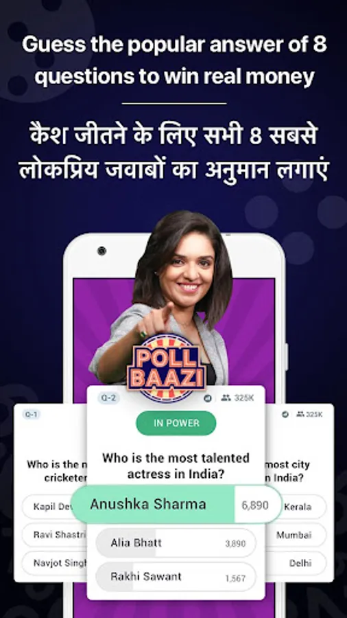 Go to PollBaazi to play & guess the quiz online. The anchor asks 8 questions with 3 options and 10 seconds to answer each. There will be no correct or incorrect answers, options with maximum submissions will be considered correct. Guess all questions correctly to win your share from prize money. You can play even after being eliminated, a late entry to the game or coming back after dropping because of the network glitch, also, use an extra life in the game to continue playing the game even after giving an incorrect answer.