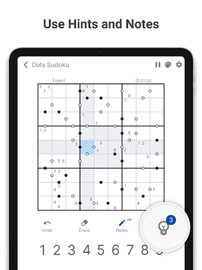 β Turn on Notes β to make notes as on paper. Each time you fill in a cell, notes are automatically updated!