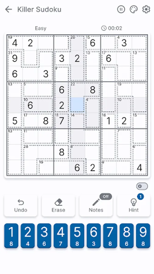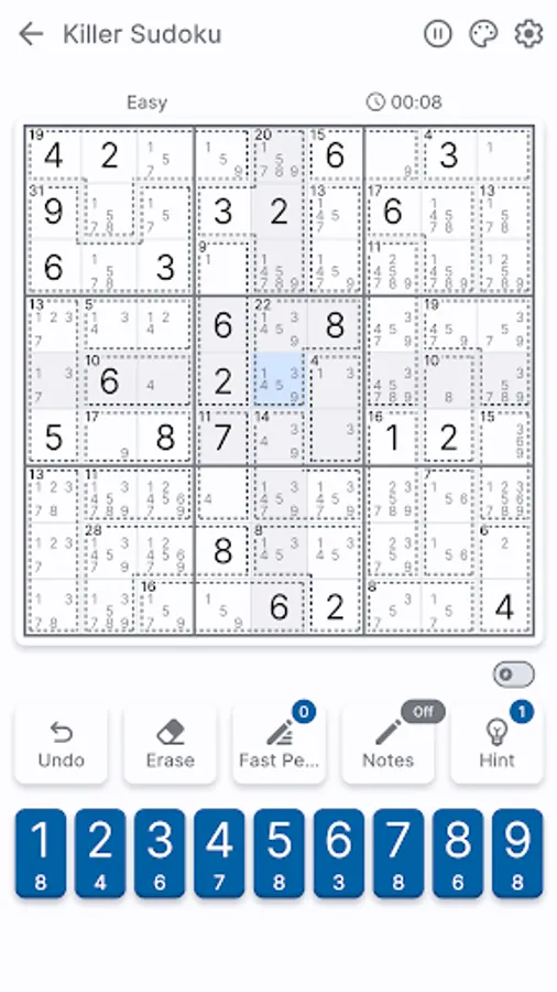 Killer Sudoku is a legend of all number games and puzzles. In a nutshell, itβs a perfect blend of a sudoku puzzle game and a kakuro game. Your goal is to fill the grid with numbers like in classic sudoku and also make sure the sum of numbers in cages (areas separated by dotted lines) is equal to the number in the upper left corner of that cage.