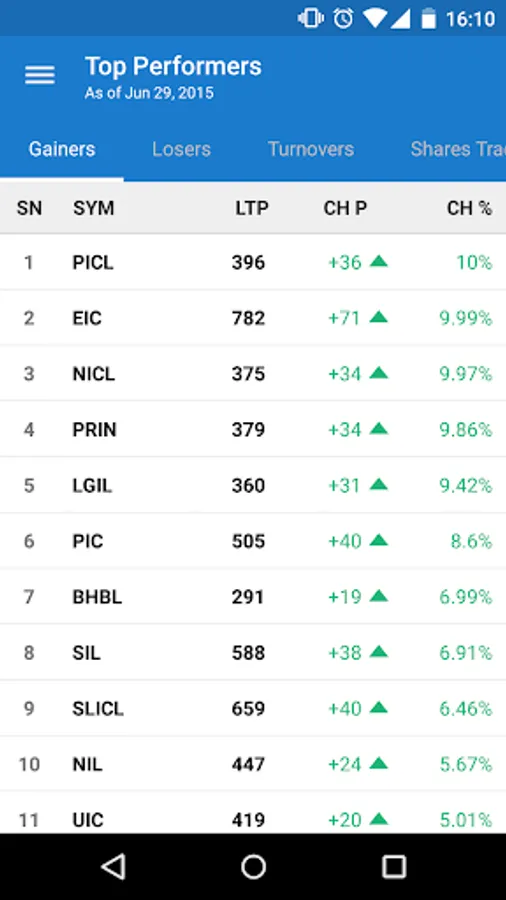 - View the top performers with lists for gainers, losers, turnovers, shares traded and number of transactions