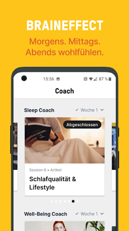With the BRAINEFFECT app, we want to help you achieve more balance in everyday life by being the first company in Germany to combine expert-based knowledge with innovative Mind Nutrition. In short units you will learn how to deal better with stressful situations, eat more consciously and get the most out of your day (and night) using routines - in just 5 minutes a day.
