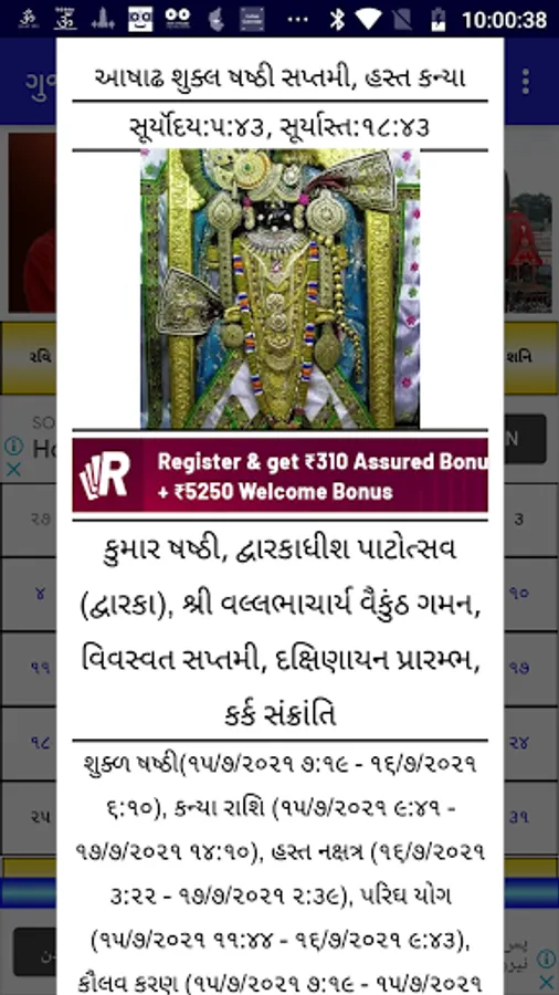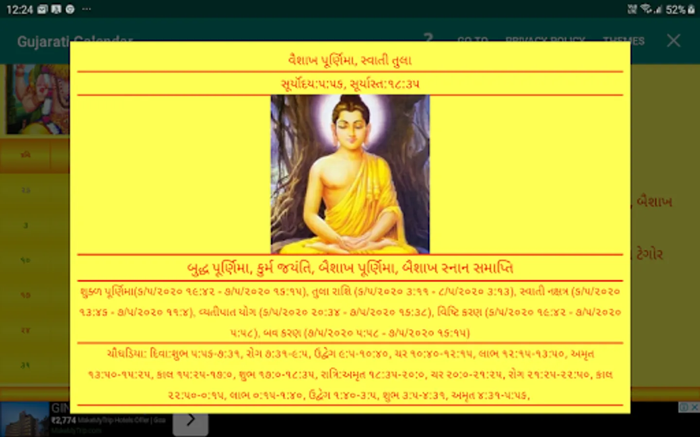 This calendar app shows the daily Panchang like Indian Day, Tithi, Rasi and Nakshatra, Yoga, Karana along with their duration and the important days when you tap on a date. It also shows the local Sunrise and Sunset times as well as special times of the day like Choghadiya. Apart from these, it also shows pictures associated with some special days when you tap on a date.
