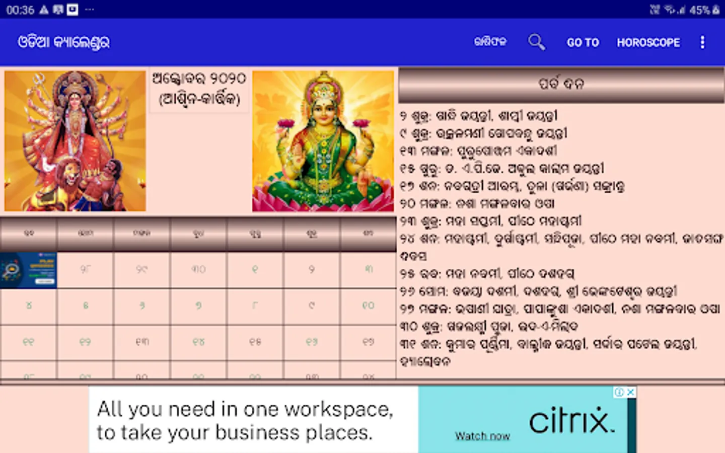 This is a calendar application useful for all the people Orissa (Odisha) and all the Odia (Oriya) people living outside Odisha (Orissa). It shows all festivals important for Oriya people as well as important Indian festivals for till year 2035, including the calendar for the year 2019.