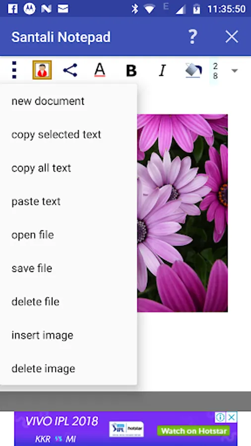 By pressing the common button at the top left corner (3 vertical dots), multiple options such as 'new document', 'copy selected text', 'copy all text', 'paste text' and 'delete file', 'insert image' and 'delete image'. Do copy and paste by selecting corresponding options.