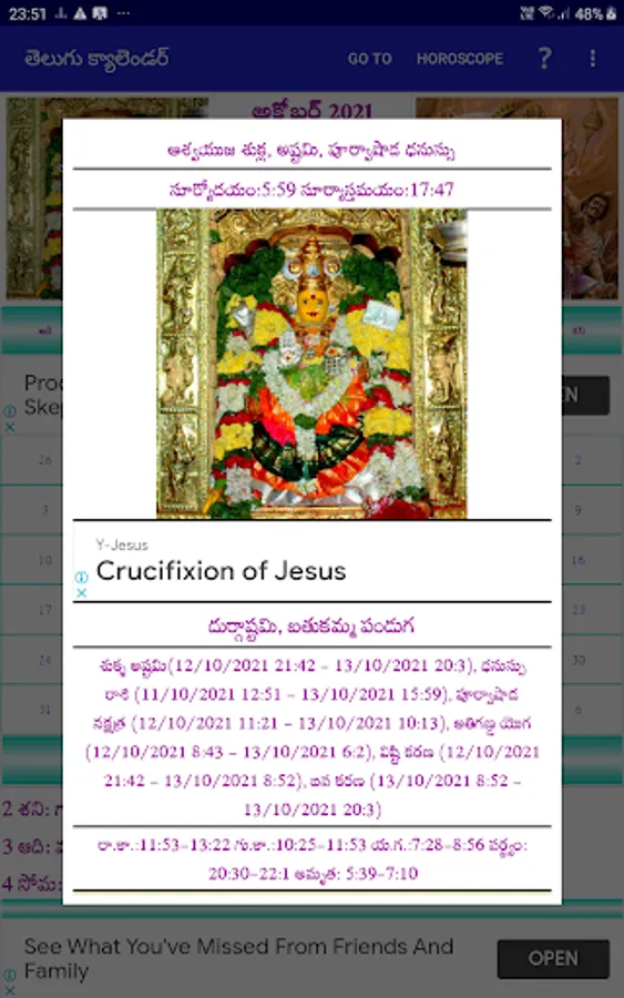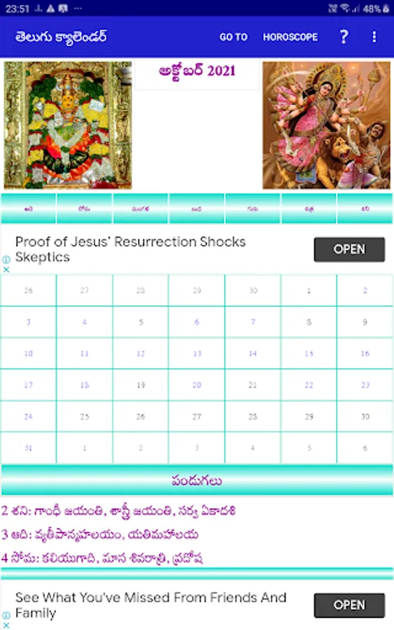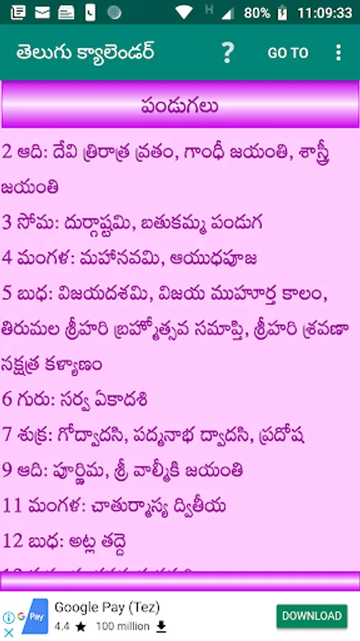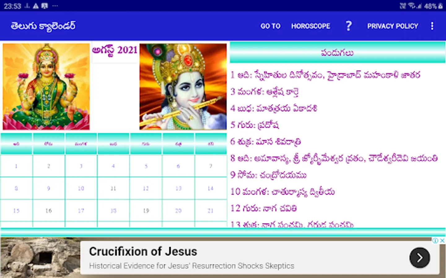 This is a calendar application useful for all the people of Andhra Pradesh, Telangana and all the Telugu friends living outside Andhra and Telangana. It shows all important Telugu festivals as well as important Indian festivals for 150 years starting 1940, including the calendar for the year 2023.