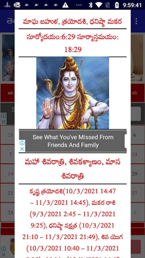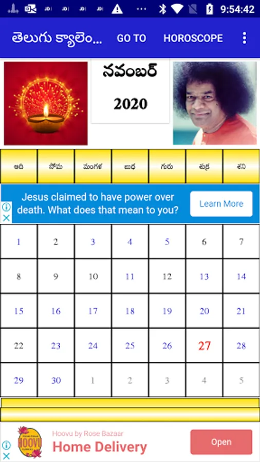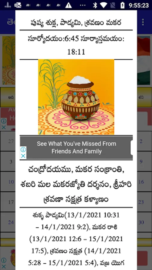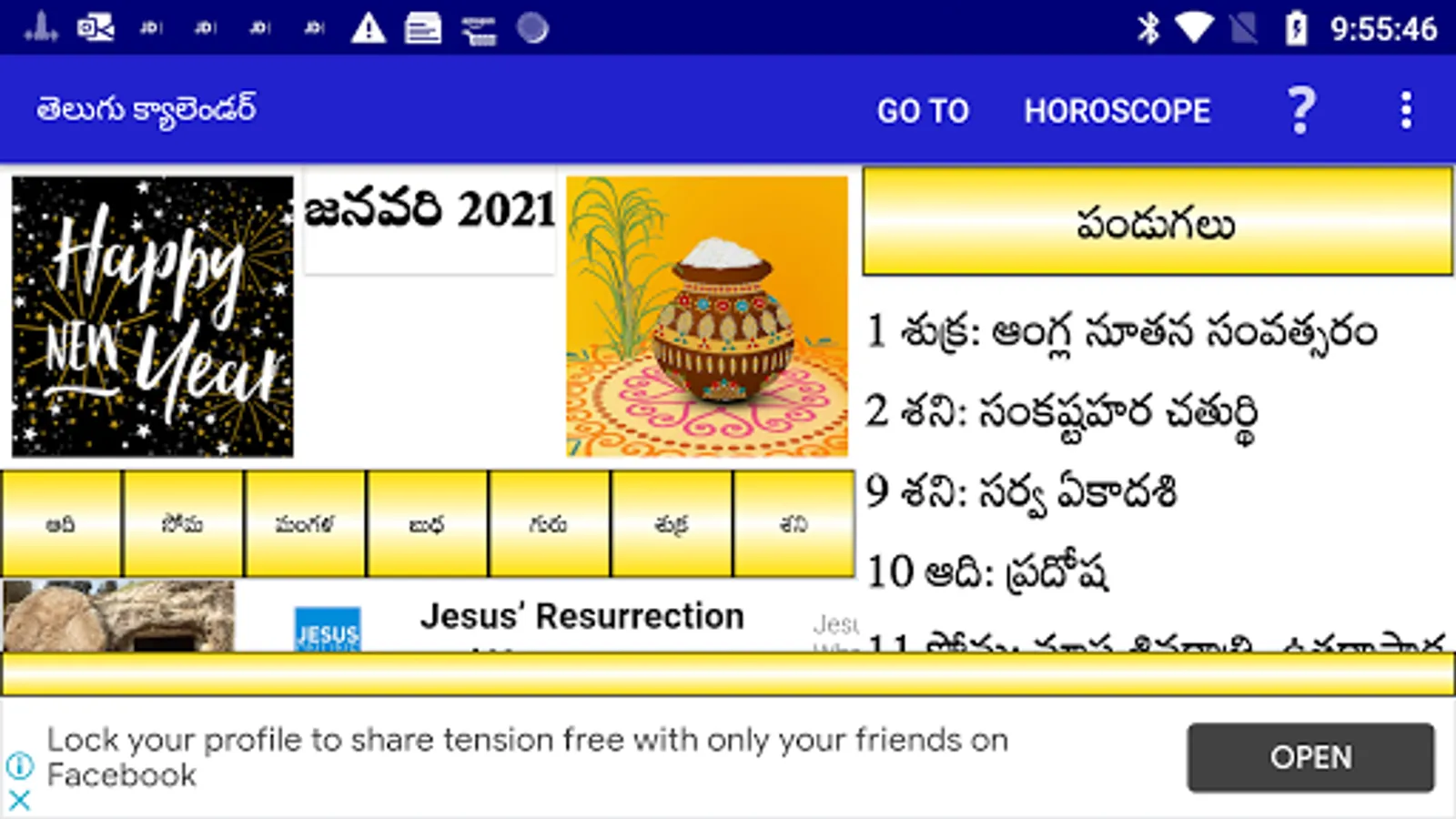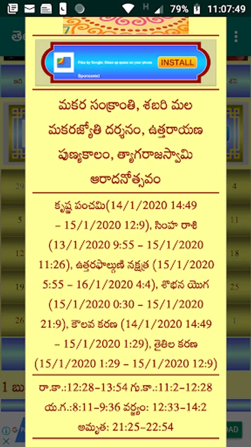 This calendar app shows the daily Panchangam such as Indian Day, Tithi, Rasi and Nakshatra, Yoga, Karana along with their duration and the important days when you tap on a date. It also shows the local Sunrise and Sunset times as well as special times of the day such as: Rahukalam, Gulikakalam, Yamagandam, Varjyam, Amrutam and Abhijeet muhurtam. Apart from these, it also shows pictures associated with some special days when you tap on a date.