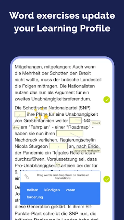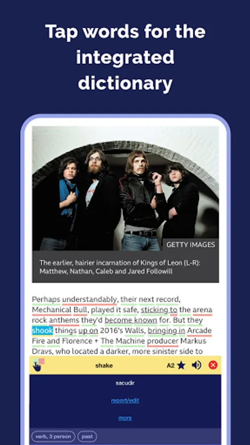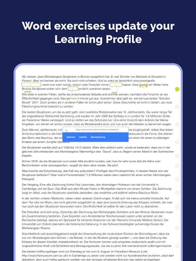 If you find a word you do not understand, tap on it for the integrated translation dictionary