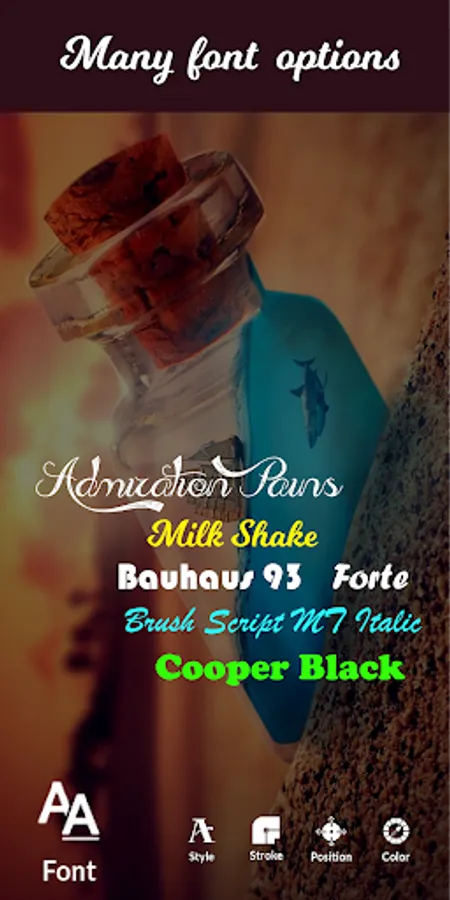 Fonts: Choose from variety of fonts provided in app. Additional option available to select and add your own fonts.