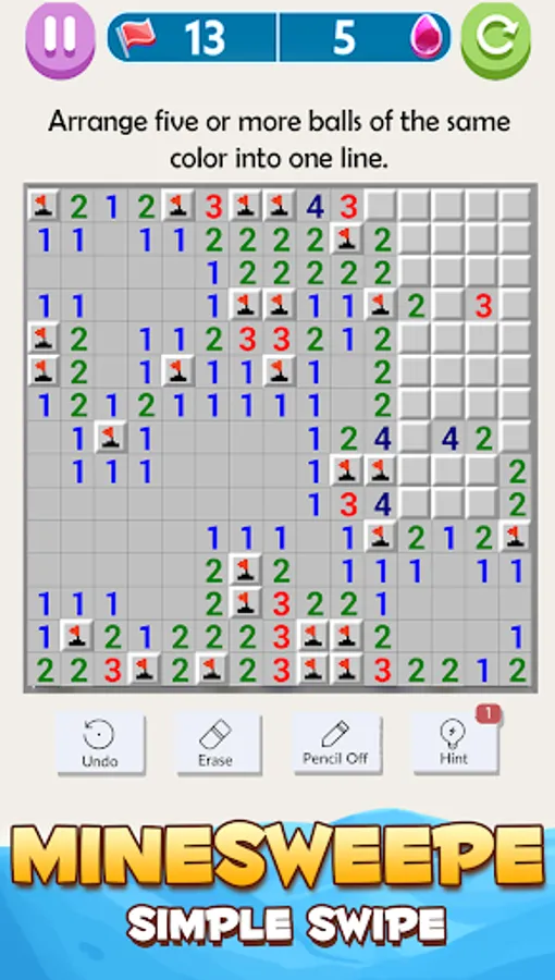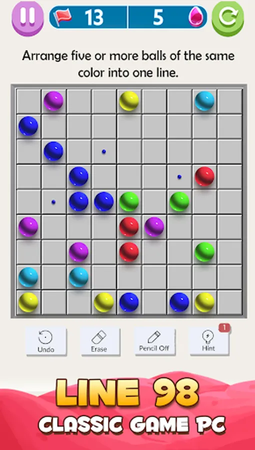 ◉ LINE 98: Arrange five or more balls of the same color into one line.